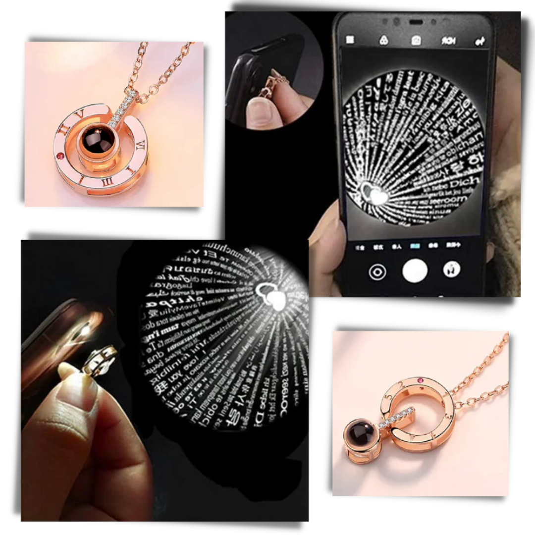 Imagina el brillo en los ojos de tu enamorada/o o pareja al recibir un collar que expresa "Te Amo" en 100 idiomas diferentes. Su diseño de ojo de pez permite proyectar su interior con la linterna de tu celular, es más que un simple accesorio es una declaración de amor universal que trasciende las barreras lingüísticas y emocionales un regalo único.